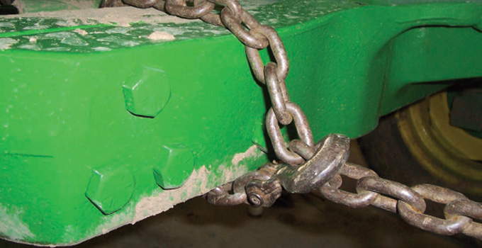 Every farm has a few chains hanging around the shop. Chains may work fine as long as they are strong enough. For example, a Grade 70 5/16-inch chain is rated for 4,700 pounds safe workload and can be used for lifting or securing loads but not for towing or vehicle extraction. A Grade 80, ½-inch chain with a rating of 11,300 pounds might be OK for pulling smaller farm vehicles. A Grade 100 ¾-inch chain would handle 35,300 pounds of working load.