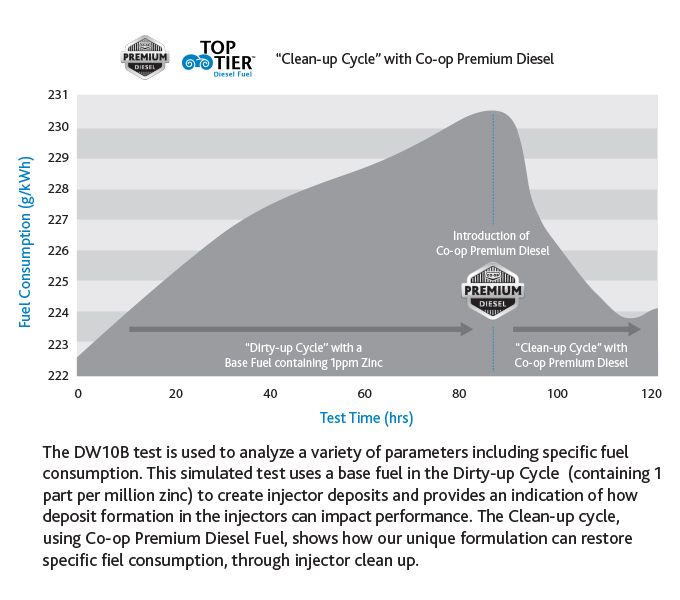 Co-op’s Premium Diesel fuel has been engineered to deliver maximum power to all modern and legacy diesel engines. Recognized industry testing has shown that Co-op’s Premium Diesel will improve deposit-related power loss in as little as one to three tank-fills, and can fully restore performance within 32 hours of operation.