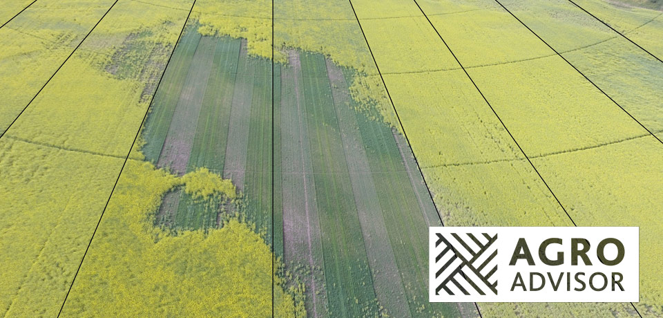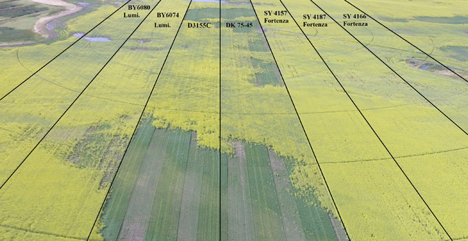 As the season progressed, canola treated with only a standard seed treatment was easy to pick out, especially when viewed from above via drone.